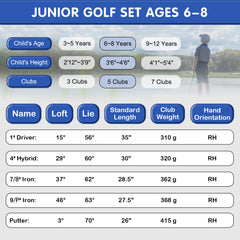 - Complete Junior Golf Club Set with Stand Bag: Designed for kids ages 6-8, this junior golf clubs set includes #3 fairway, #7/8 iron, and putter. With graphite/stainless steel shafts, alloy heads, and a lightweight stand bag, it provides everything young golfers need to start swinging with confidence.